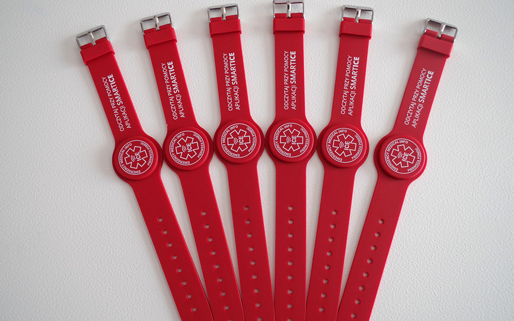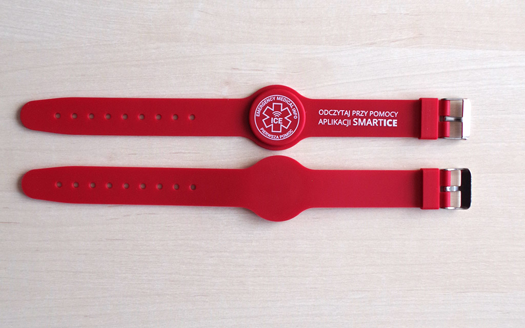 Opaska ICE zawierajaca chip, na który można nagrać za pomocą bezpłatnej aplikacji SMARTICE informacje o stanie twego zdrowia, przyjmowanych lekach i uczuleniach oraz kontaktach do najbliższych.