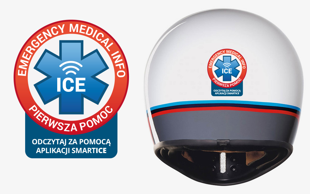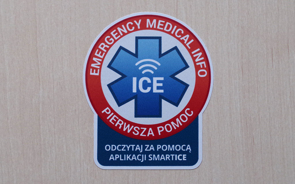 Naklejka ICE zawierajaca chip, na który można nagrać za pomocą bezpłatnej aplikacji SMARTICE informacje o stanie twego zdrowia, przyjmowanych lekach i uczuleniach oraz kontaktach do najbliższych.